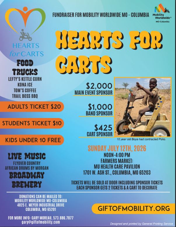 Decorate a Mobility Cart for someone with leg disabilities in Kenya (boy, girl, woman, or man). You can take a cart to decorate yourself or with your family, business, or group. Compete for the title of Best Decorated Cart, as voted by attendees!